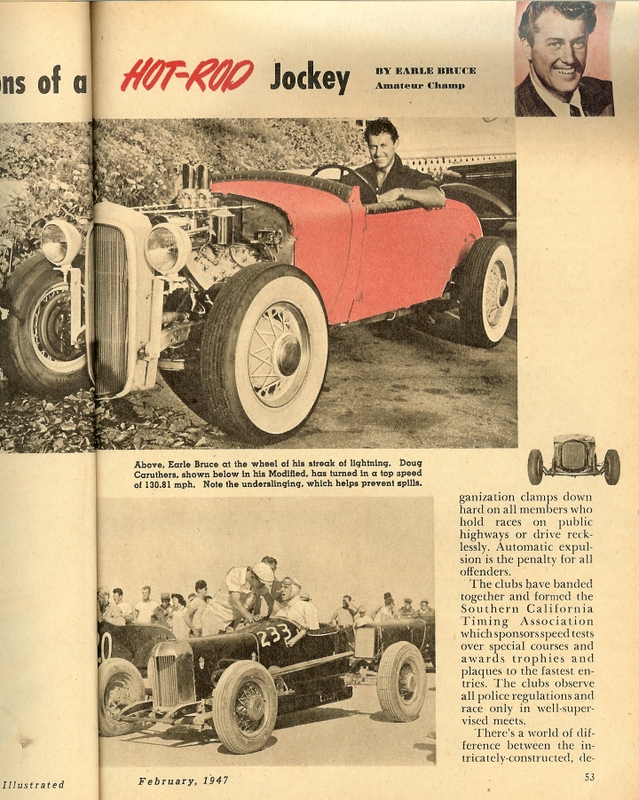 | February 1947, Mechanix Illustrated article by Earl Bruce about SCTA Racing at El Mirage. Story features Randy Shinn, Doug Caruthers and the Road Runners. Interesting to read what it cost to build and run a Lakes car back then! (Courtesy of Roy Caruthers ) |